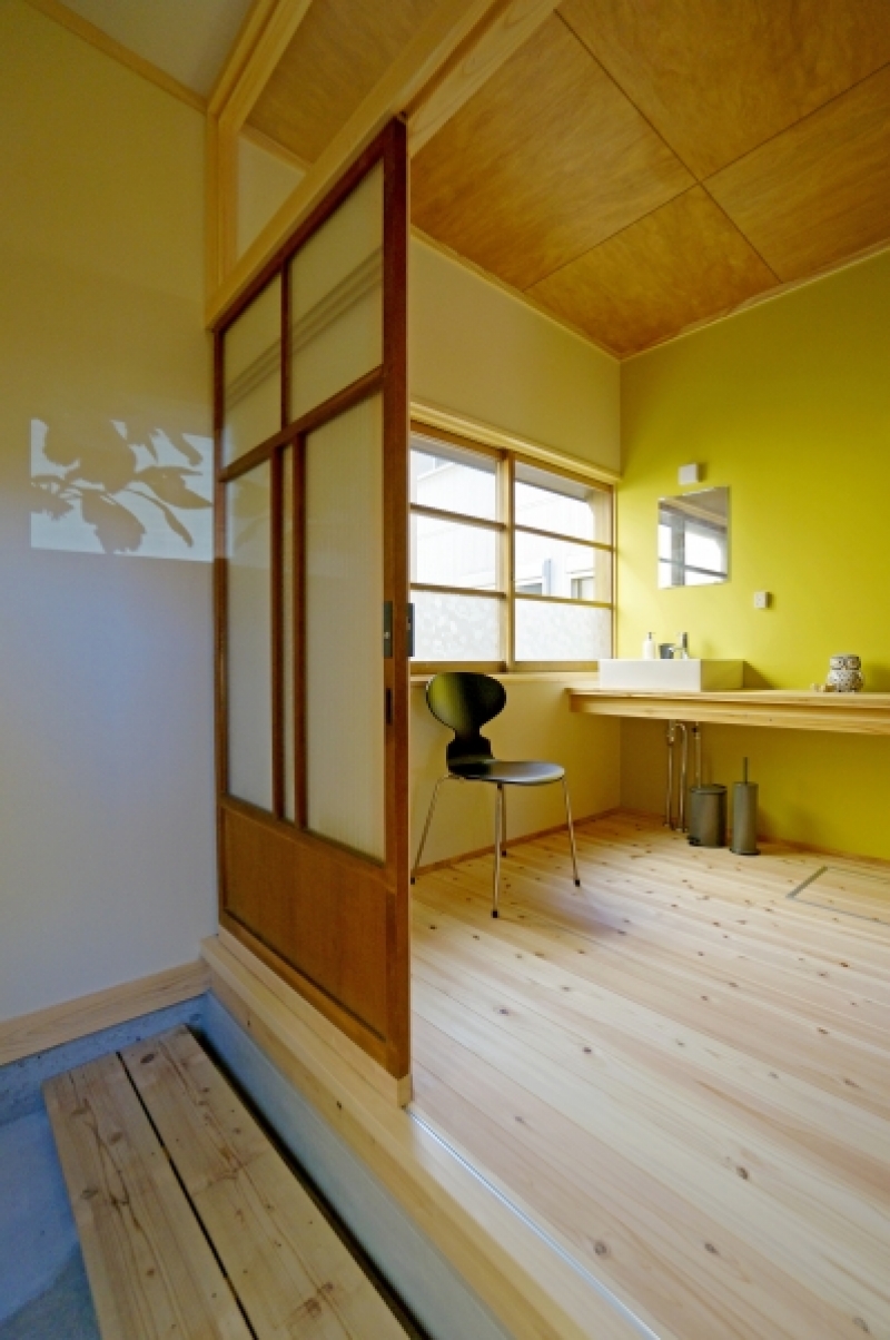 暗くなりがちな洗面スペースを、外部から入る自然光とよく合う壁色を選ぶことですっきり明るい空間に。壁に写る外部樹木の影もこの空間のポイント。